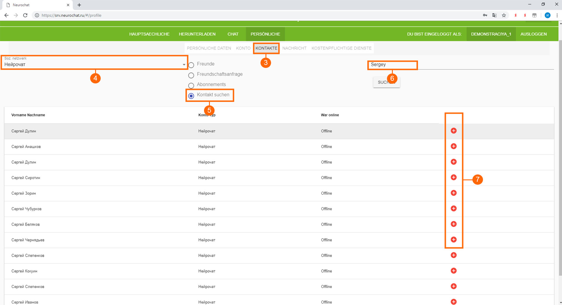 Um einen neuen Kontakt in die Freundesliste einzufügen, gehen Sie zu „Kontakte“ 3 klicken Sie das soziale Netzwerk 4 an, in dem Sie suchen wollen und dann klicken Sie den Kreis 5 „Kontaktsuche“ an; anschließend geben Sie den Nutzernamen bei 6 der Suche ein. Nachdem Sie den Kontakt gewählt haben, werden unten alle Nutzer erscheinen, die diesen Namen tragen. Klicken Sie das Zeichen „+“ 7, das gegenüber dem Namen steht.