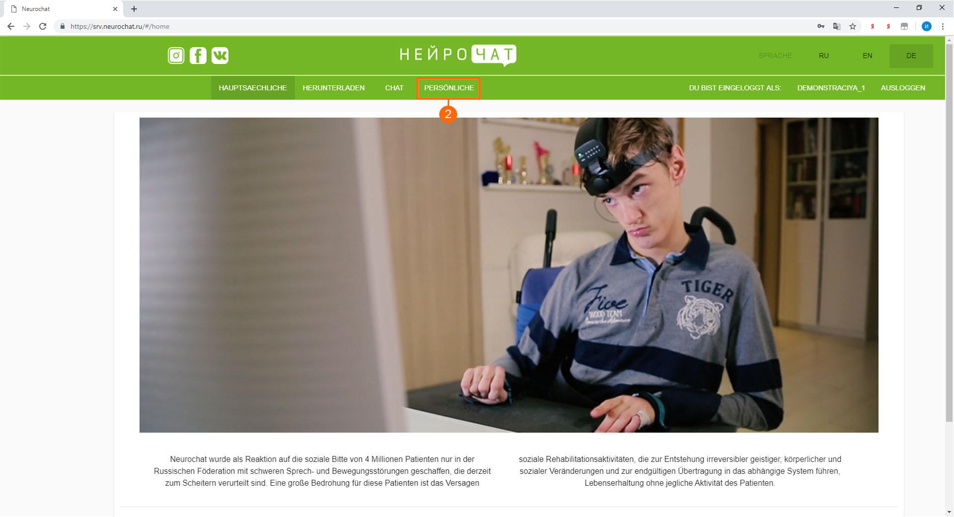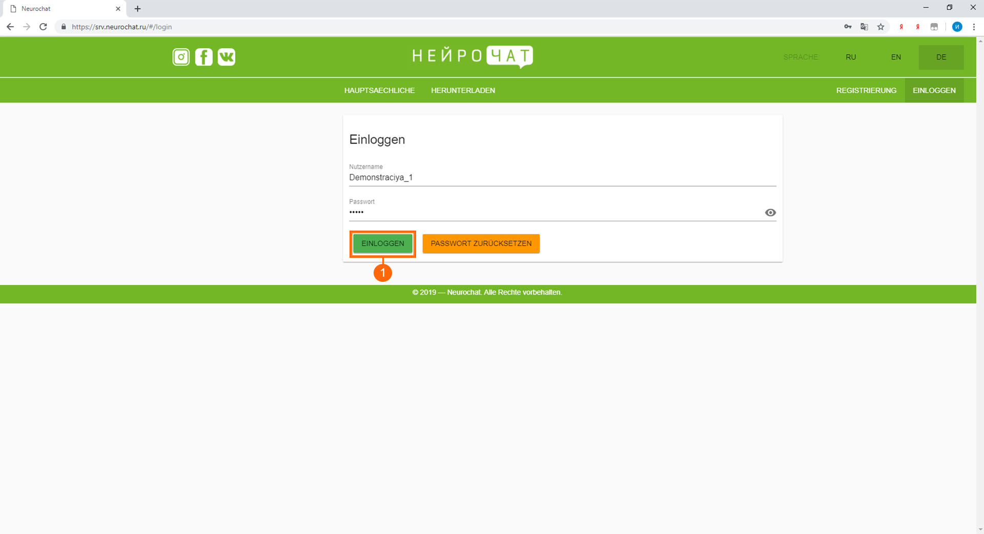 Im Feld „Login“tragen Sie den bei der Registrierung gewählten „namen_des_benutzers“ ein und im Feld „Passwort“ - den bei der Registrierung gewählten Passwort, danach den 1 Knopf „Login“ drücken.