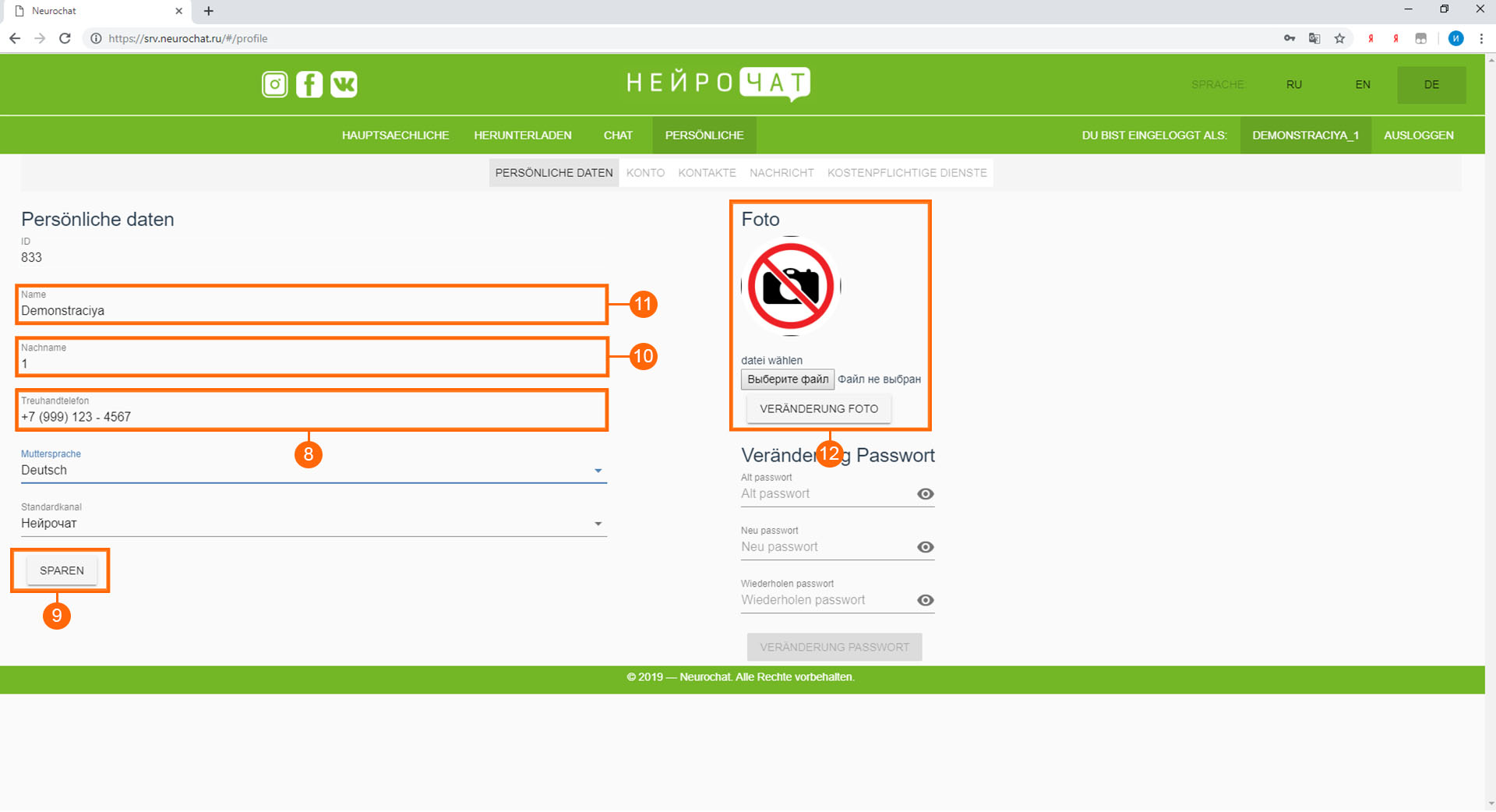 Um eine Mobilnummer hinzuzufügen, an die Nachrichten, die mithilfe des Programms „Neurochat“ sowie die alarmierenden Nachrichten und di Nachrichten, die über den Zustand informieren („habe Hunger“, „will schlafen“ u.s.w.) geschickt werden, tragen Sie die Handnummer in das Feld 8 „Nummer der Vertrauensperson“ ein und klicken Sie dann 9 „Speichern“. Hier können Sie auch den 10, Nachnamen 11 und den Vornamen ändern und ein Foto einfügen. 12