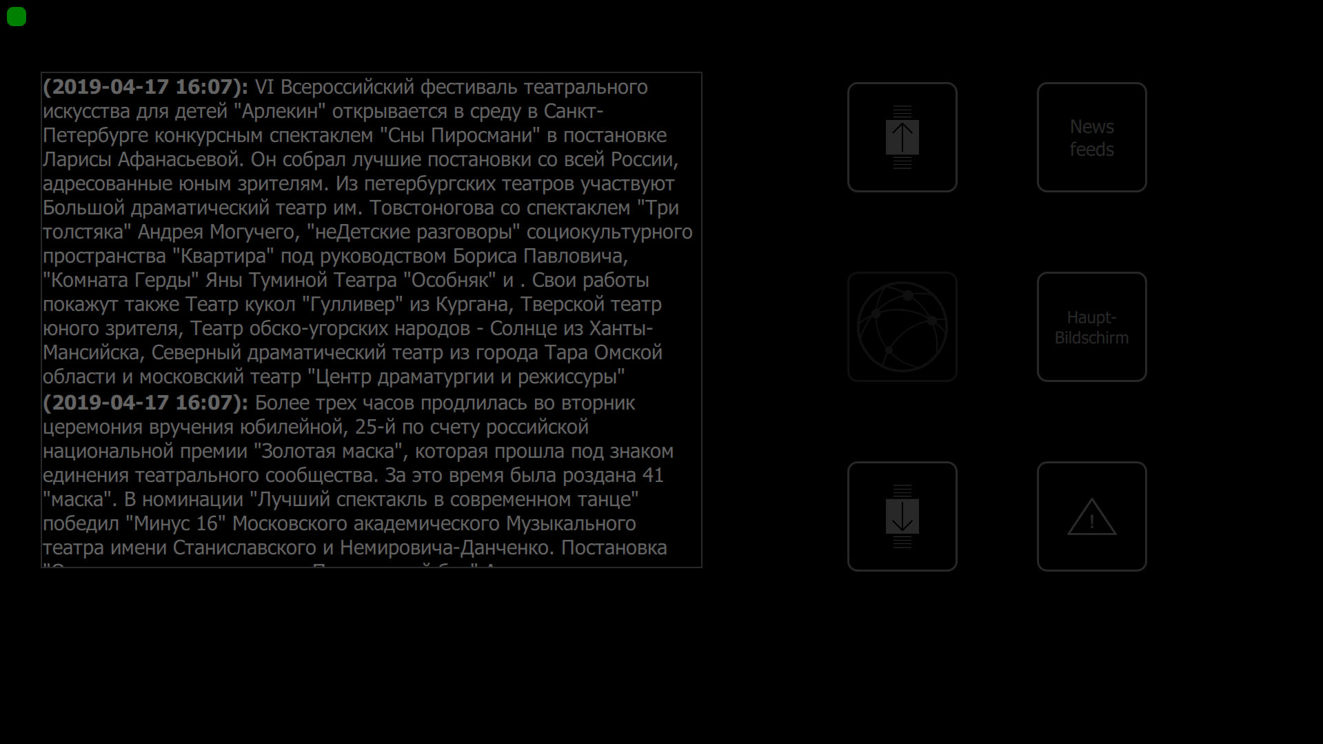 Das News Feed gibt die letzten Neuigkeiten aus dem Kulturbereich wieder. Über die Pfeil-Tasten kann man die Nachrichten nach oben oder unten durchblättern.
